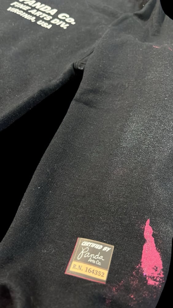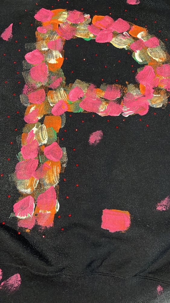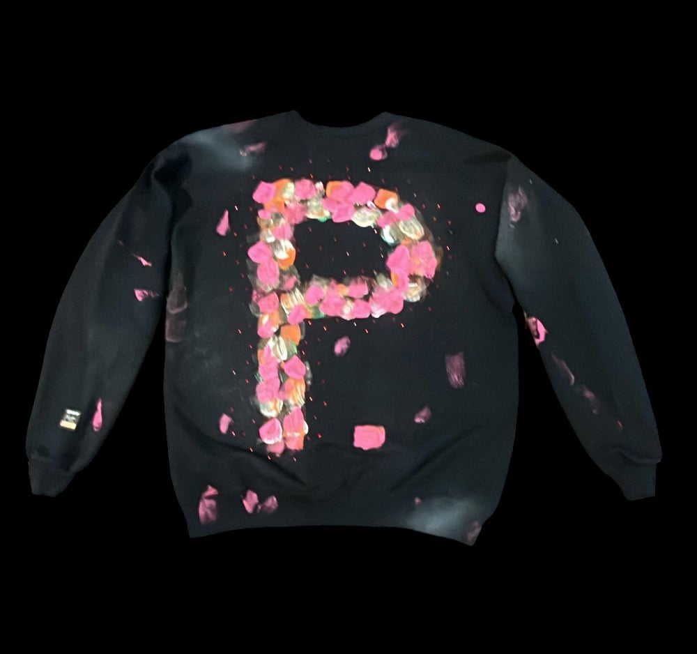 This crewneck sweater is part of a hand painted collection in which each garment feature a hand painted P. as the back graphic. This hand painted series wil continue over